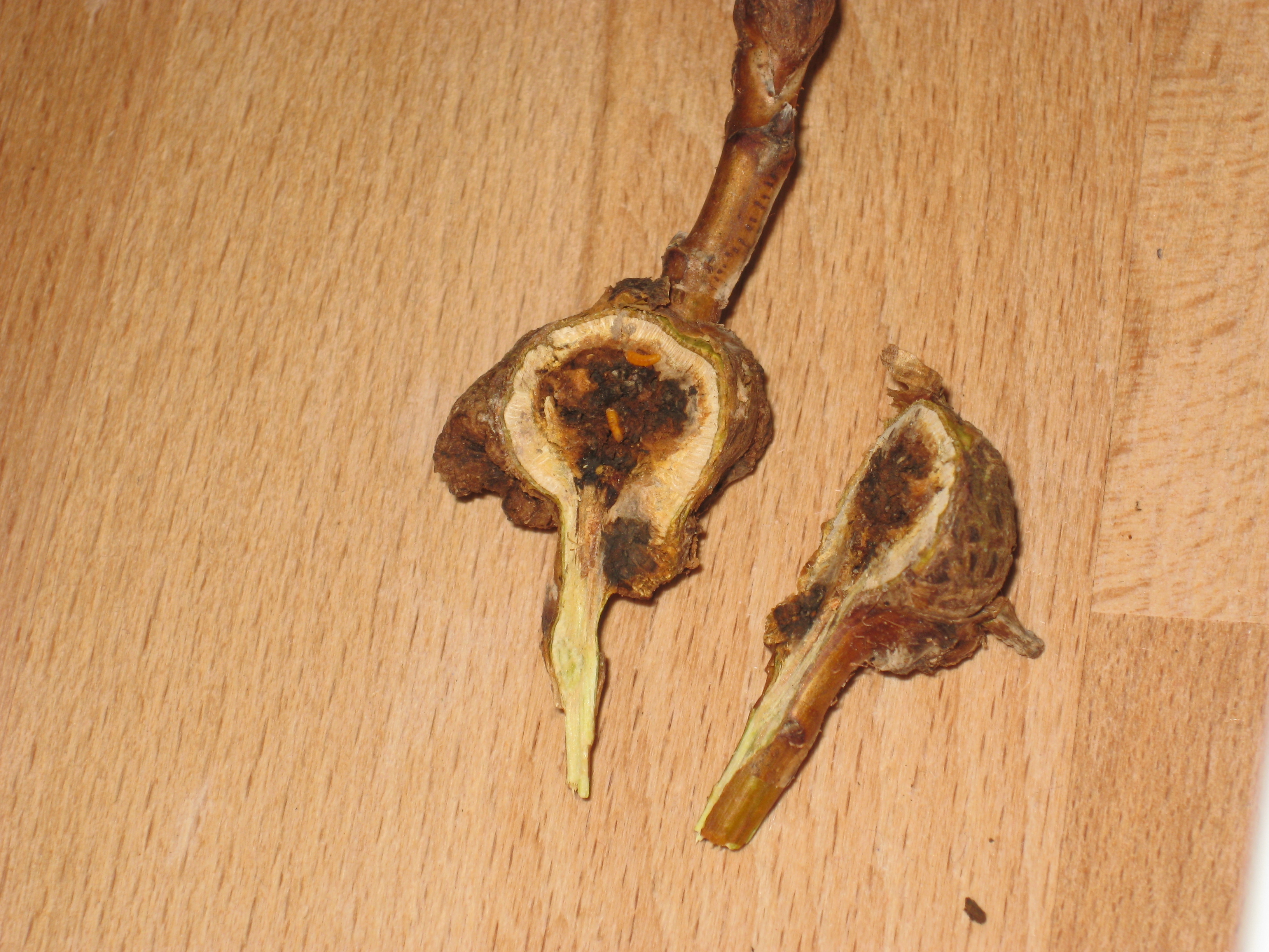Larven der Himbeergallmücke, in einer Verwucherung der Himbeerrute
